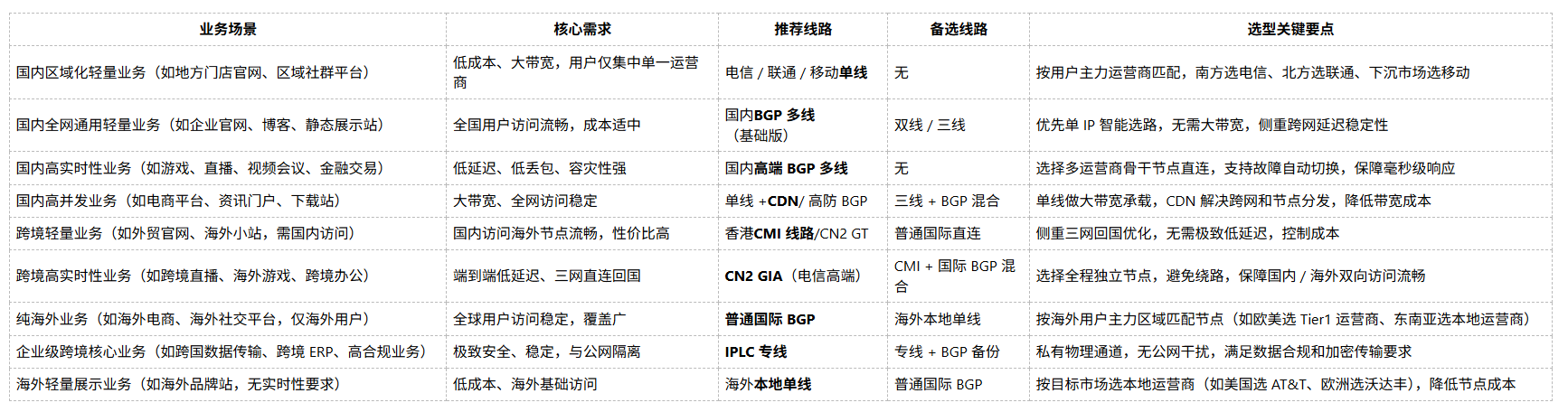 - 按用户地域选:国内用户仅集中在南方 / 北方,选电信 / 联通单线;全国用户分布,选国内 BGP 多线;需兼顾国内访问的跨境业务,优先 CN2 GIA/CMI;纯海外用户,选普通国际 BGP 即可。